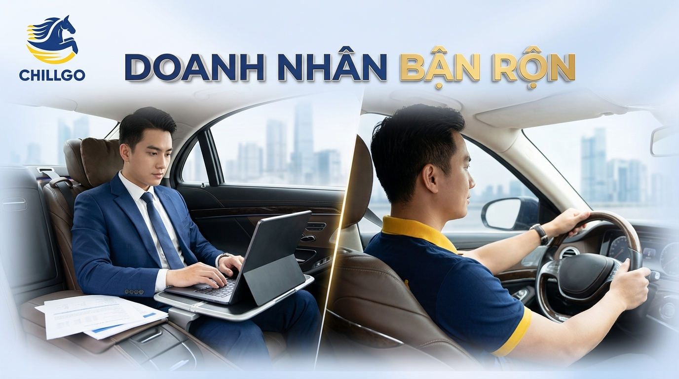 Giải pháp ChillGo: Thay vì tự lái xe mệt mỏi, bạn có thể thuê tài xế ChillGo và tập trung vào công việc. Trên xe, bạn có thể họp trực tuyến, xem tài liệu, gọi điện mà không lo gì. Tài xế sẽ lái xe an toàn và chuyên nghiệp, bạn chỉ cần ngồi thoải mái.
