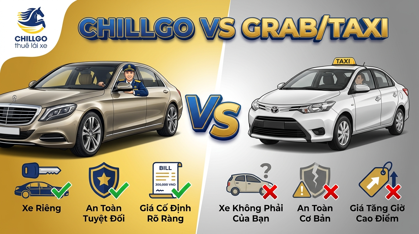Điểm khác biệt chính: Khi sử dụng ChillGo, bạn vẫn giữ được xe của mình – tài xế ChillGo chỉ lái thôi. Khác với Grab/Taxi, nơi bạn phải lên xe lạ của tài xế.